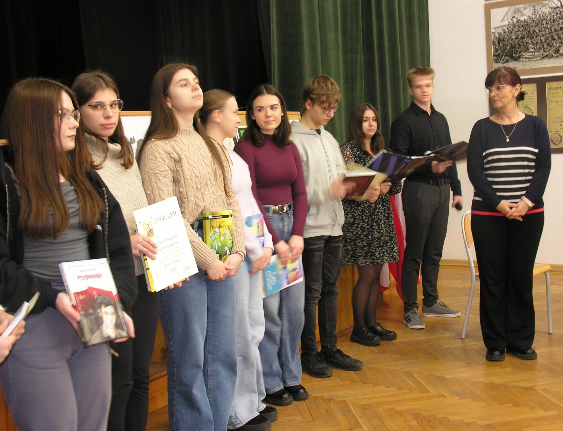 Nagrodzono też laureatów trzech konkursów: wiedzy o życiu i twórczości Stefana Żeromskiego, literackiego i plastycznego przebiegających pod hasłem „Sen o Polsce”. Nagrodzone uczennice, w ramach konkursu literackiego: Ania Michałkiewicz, Aurelia Hapłyk i Wiktoria Kłębucka, zaprezentowały swoje utwory. Laureatki konkursu plastycznego: Aleksandra Zapalska, Aleksandra Mroczkowska i Oliwia Ziembowska krótko przedstawiły myśli przewodnie swoich prac, którym przypisać można by tytuły: Tęsknota – Wolność - Nadzieja. Spotkanie prowadzili: Hania Tera i Jakub Cieślak.